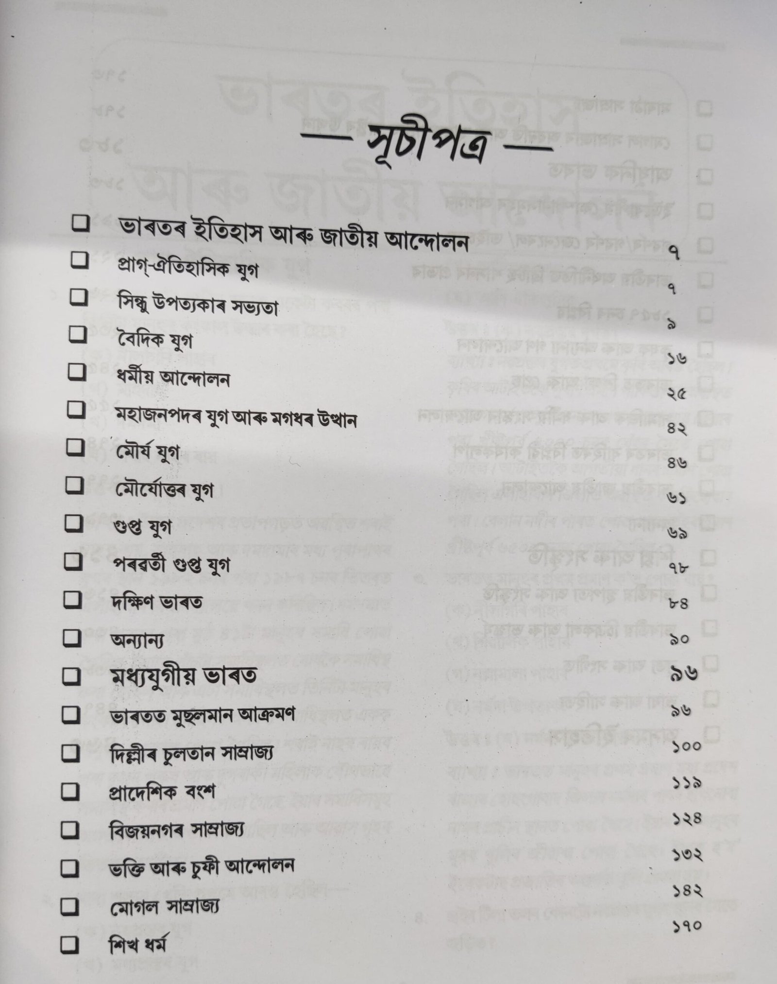 This book is a comprehensive guide for aspirants preparing for competitive examinations like APSC, UPSC, and other state-level civil services where General Studies Paper 1 is a key component. Written in Assamese medium, it presents a clear and chronological account of India’s ancient, medieval, and modern history with a special emphasis on the Indian National Movement.