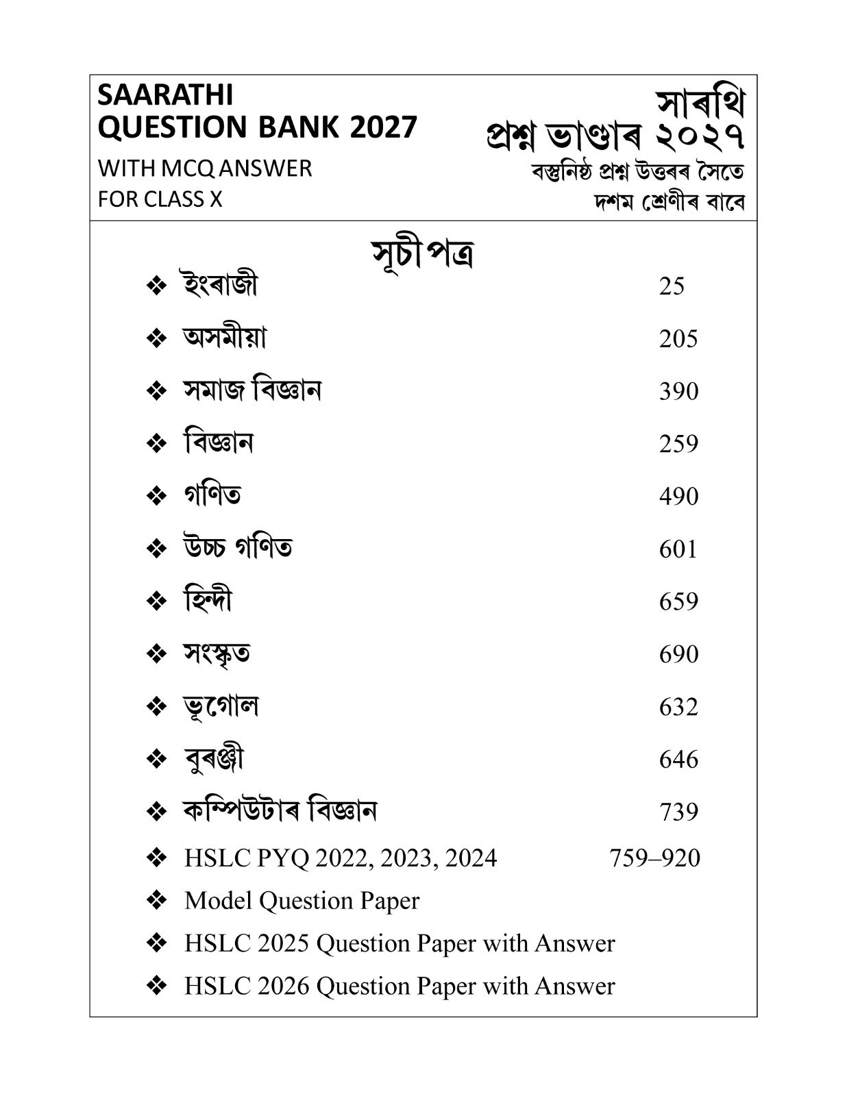 Saarathi Question Bank With MCQ Answer is a comprehensive exam preparation book designed for Class X HSLC 2027 examinees in Assamese medium. The book focuses on providing a large collection of multiple-choice questions (MCQs) along with answers to help students practice objective-type questions effectively.